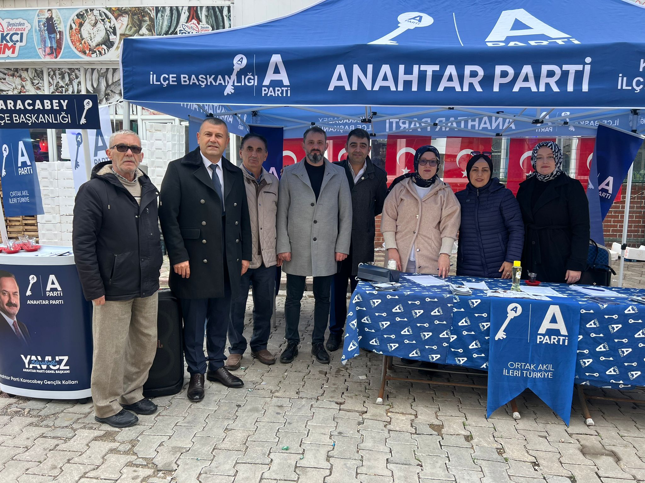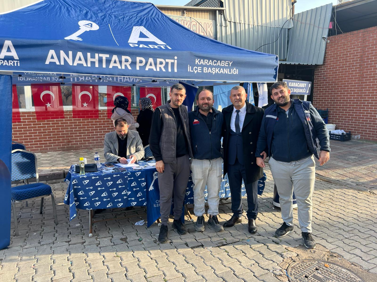 Anahtar Parti, Karacabey'de ilk kez bir tanıtım ve iletişim standı açarak vatandaşlarla buluştu. Ömer Matlı Pazaryeri Balık Halı önünde kurulan standa halktan yoğun bir ilgi gösterildi.