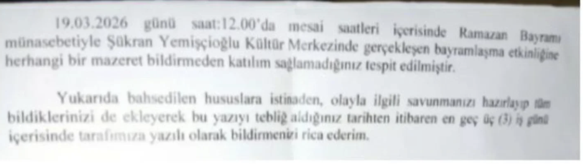 “İddiaya göre, Fatih Karabatı ile gerçekleştirilen bayramlaşma programına katılmayan personele savunma yazısı gönderildiği ve “mazeret bildirmeksizin katılım sağlanmadığı” gerekçesiyle açıklama talep edildiği ifade edilmektedir. Bu durum, kamu çalışanlarının iradesi üzerinde bir baskı oluşturulup oluşturulmadığı sorusunu kaçınılmaz hale getirmektedir.